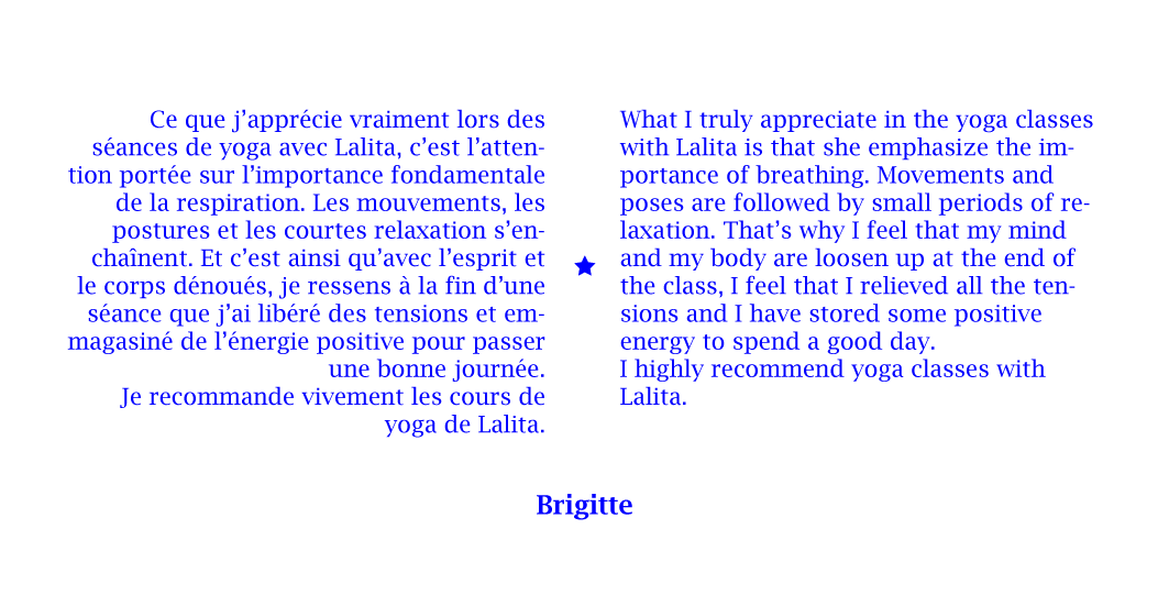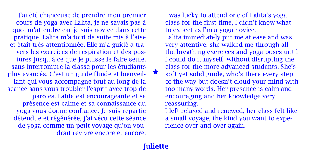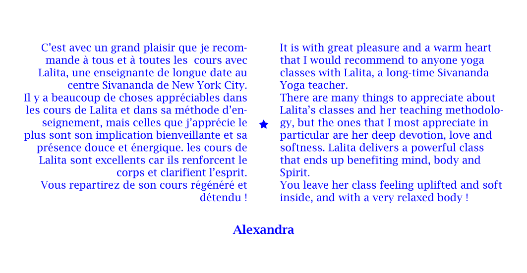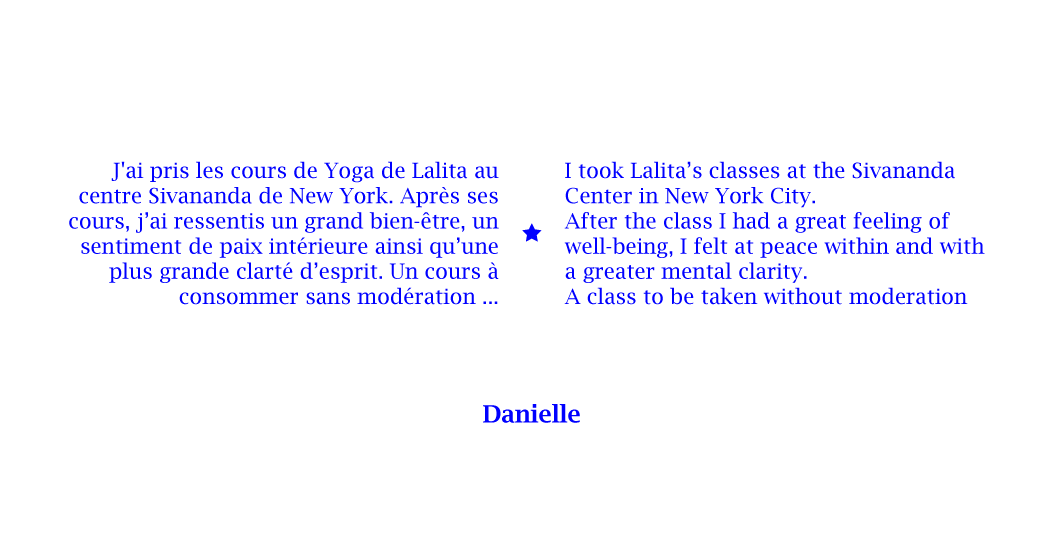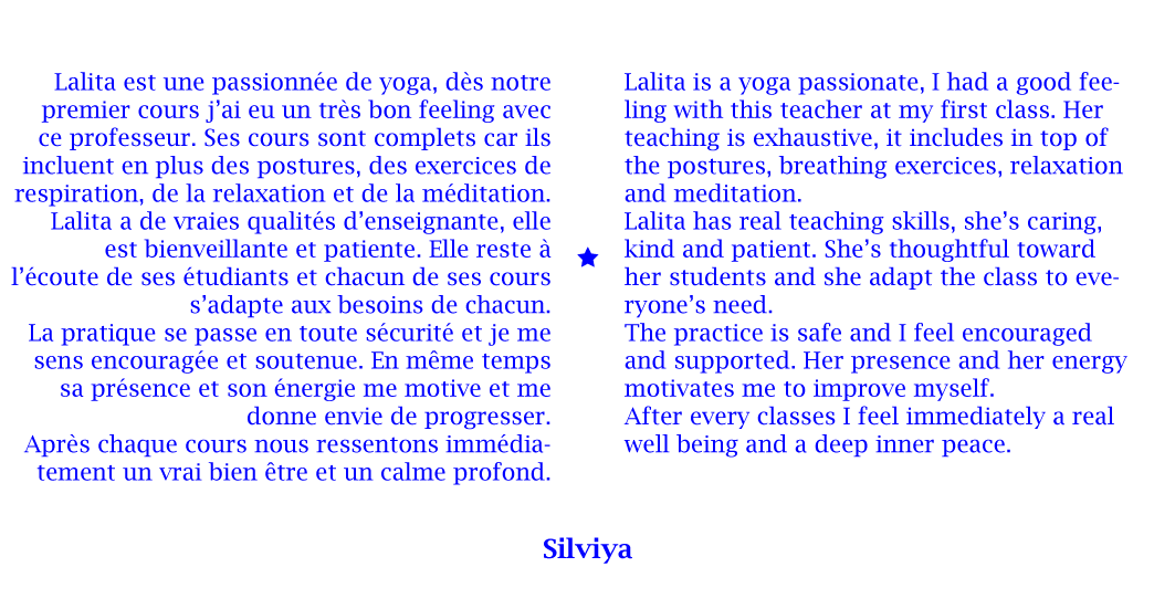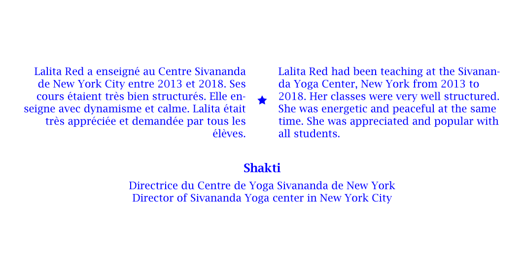 En 2013, j’ai été certifiée à New York comme professeur de Hatha Yoga Traditionnel par L’Organisation Internationale Sivananda Yoga Vedanta, et depuis j’ai transmis à New York, à Marseille et dans le Vaucluse, cette pratique aux adultes et aux enfants en anglais et en français.